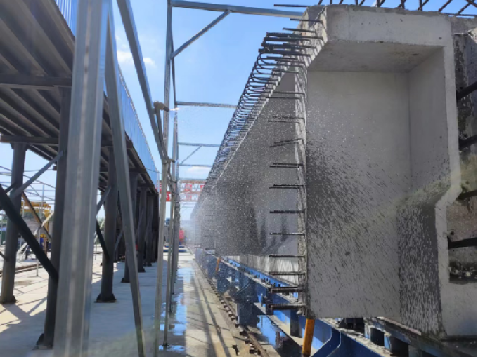 自動(dòng)噴淋系統(tǒng)噴嘴在水流沖擊下360°不斷旋轉(zhuǎn),將養(yǎng)護(hù)水噴到待養(yǎng)護(hù)梁的每個(gè)角落